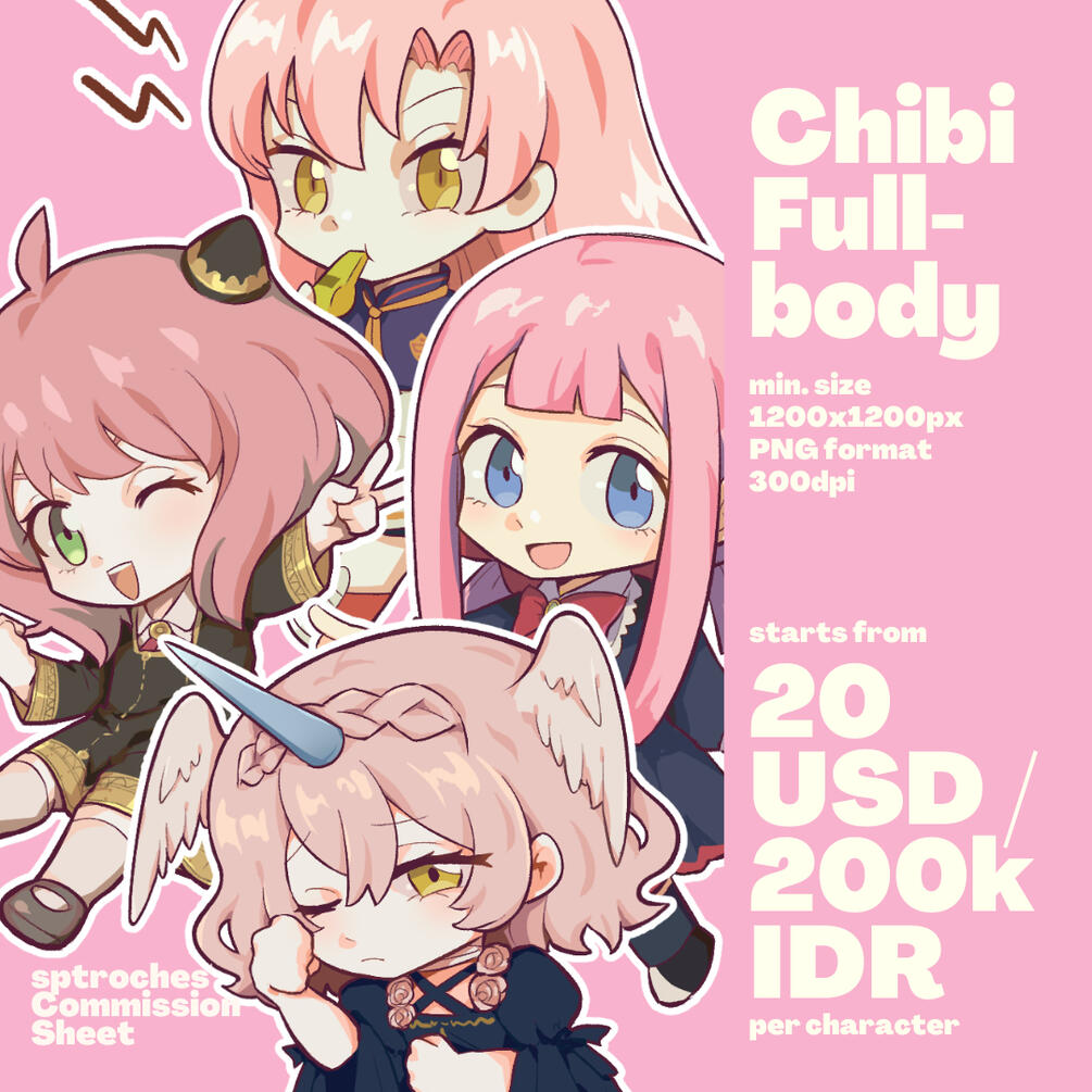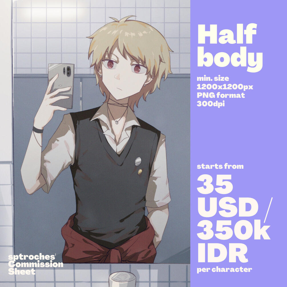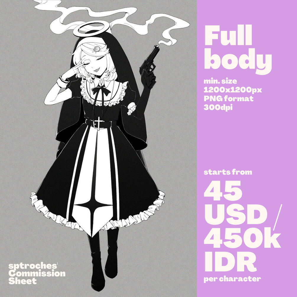 Extra fee may apply based on the complexity of details, pose, revisions, and additional background / characters.